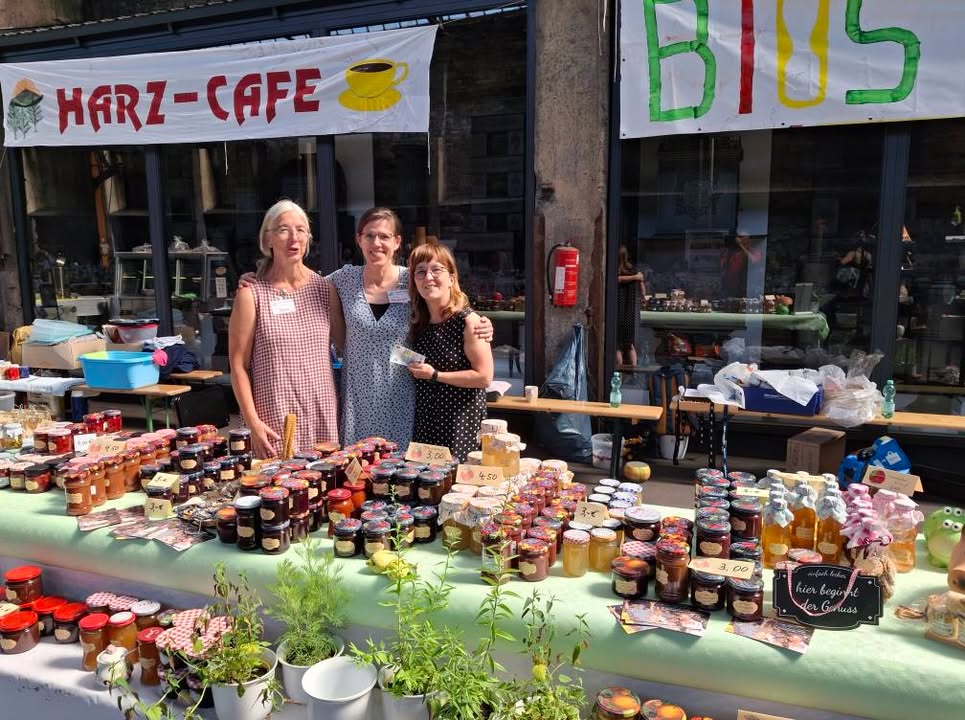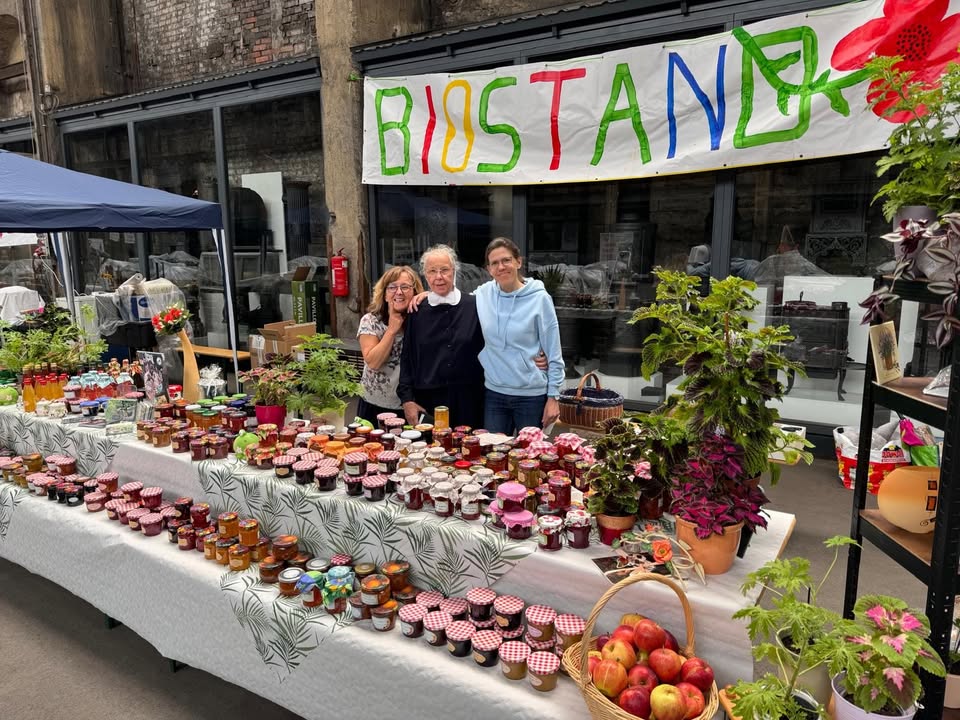 Neben anderen Ständen ist auch unser Ostafrika-Projekt e.V. mit zwei grossen Tischen vor Haus Tanne vertreten. Hier bietet Annegret Produkte, wie Keramik, Schmuck, Taschen und vieles mehr aus Ostafrika an. Und am zweiten Tisch, unserem Bio-Stand, verkaufen Jana und Frau Grau leckere Waren aus eigener Herstellung. Allein über 30 verschiedene Sorten von Marmeladen sorgen dafür, dass fast jede Geschmacksrichtung bedient werden kann. So gibt es z.B. Marmelade, Soßen, Letschow und Chutney von Tomaten aus kenianischem Saatgut.