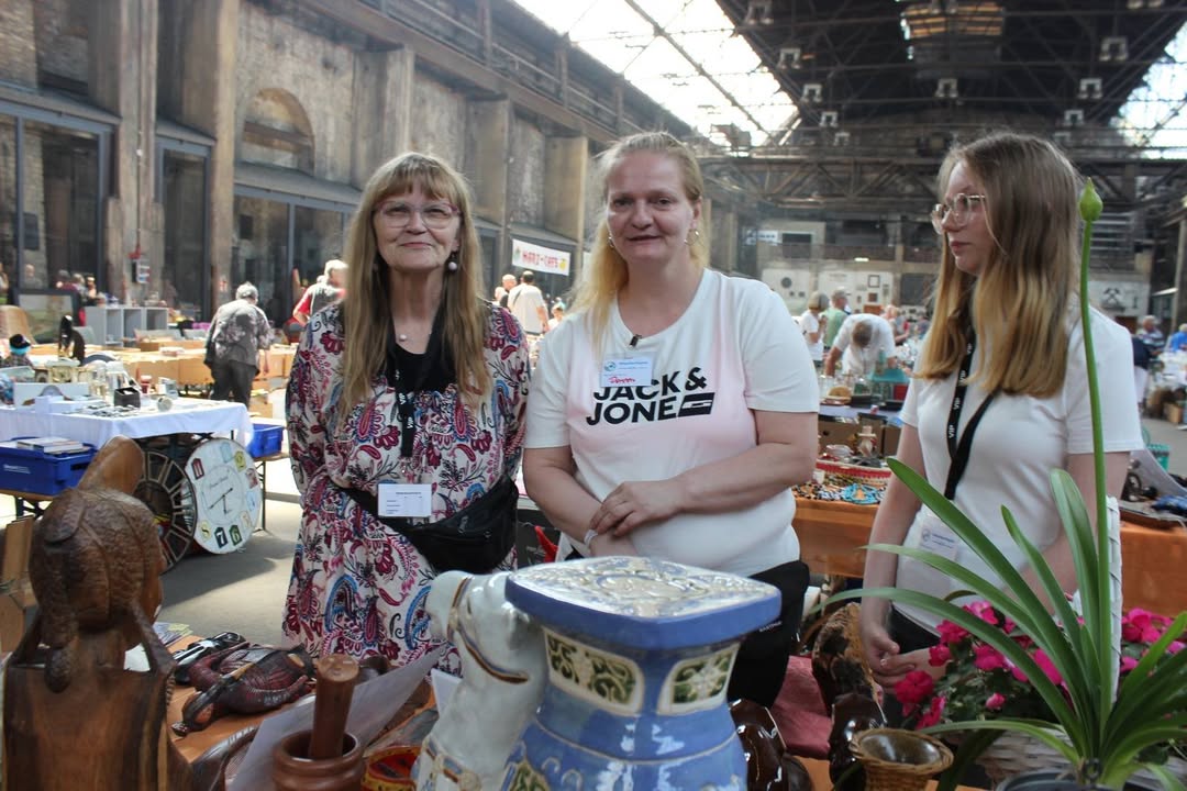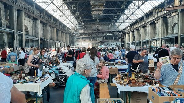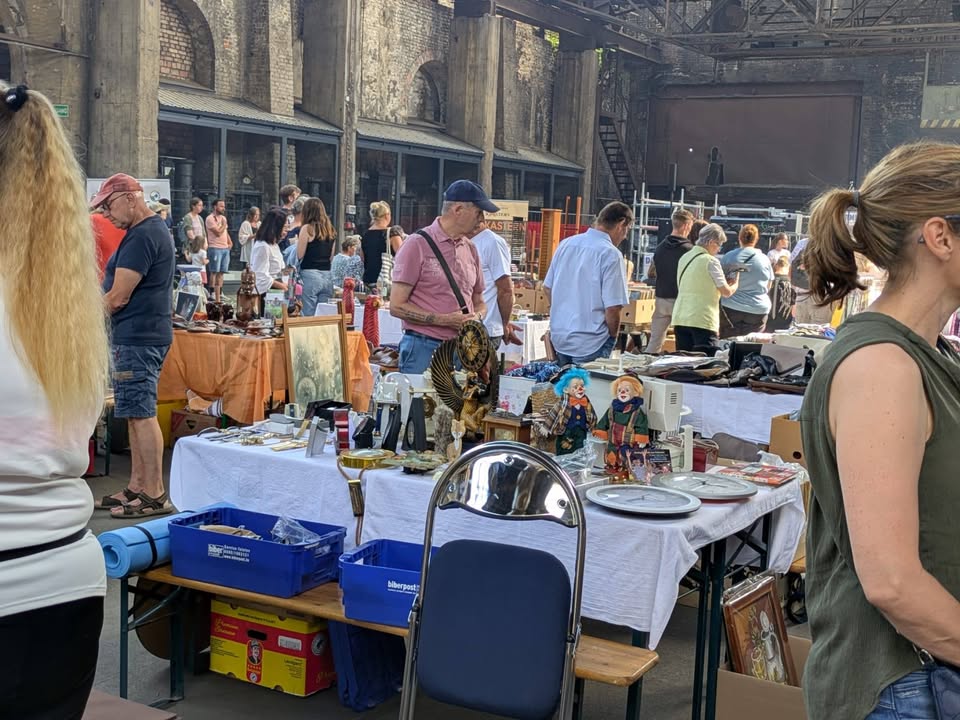Viele bunte Tische mit Flohmarktartikeln in der Halle laden zum Stöbern ein.